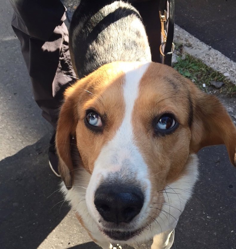 Его папа – шелти окраса мерль, а мама – бигль. Гетерохромия радужной оболочки – это особенность, при которой глаза имеют разный цвет.