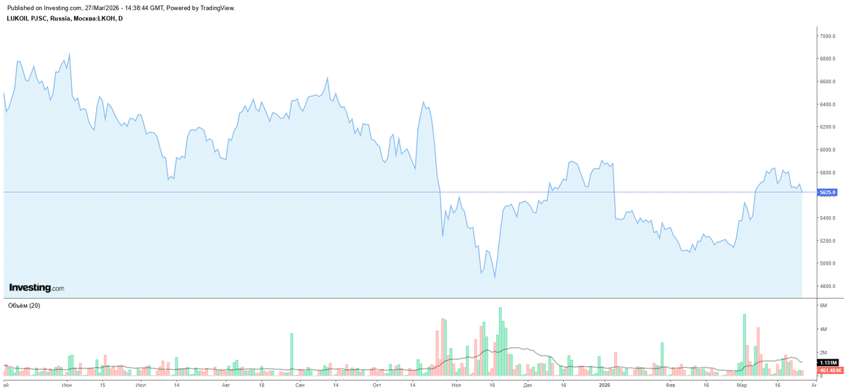 Разбор на 27.03.2026 | Автор: KAM Analytics ⚠️ 18+ | Не является индивидуальной инвестиционной рекомендацией 🎯 СУТЬ ЗА 10 СЕКУНД Рекомендация: ПРОДАВАТЬ / НЕ ТРОГАТЬ Цель снижения: 5 500 → 5 400 ₽ Три фактора, которые игнорировать нельзя: 1️⃣ Опционы: Крупные игроки купили 4 268 путов на 5 500 ₽ — это прямая ставка на падение 2️⃣ Стакан: На покупку — 50 лотов, на продажу — тысячи. Покупателей нет 3️⃣ Техника: Медвежье поглощение + пробой поддержек Подробный разбор с графиками — в конце статьи 👇 📉 ЧТО ПРОИСХОДИТ ПРЯМО СЕЙЧАС 💰 Текущая цена: 5 611 ₽ (-1,54% за день) 📊 Объем торгов: 479 587 акций (выше среднего — подтверждает продажи) 📅 Диапазон 52 недель: 4 815 – 7 129 ₽ 🎯 Ключевая цель: 5 500 ₽ (опционный страйк) [Вставьте скрин графика LKOH с уровнями] 🎲 ПОЧЕМУ КРУПНЫЕ ИГРОКИ ГОТОВЯТСЯ К ПАДЕНИЮ 🔴 Сигнал №1: Опционный рынок Путы на 5 500 ₽: 4 268 контрактов (открытый интерес) Коллы на 5 750 ₽: 568 контрактов Что это значит: Крупный капитал уже заплатил премию, чтобы заработа