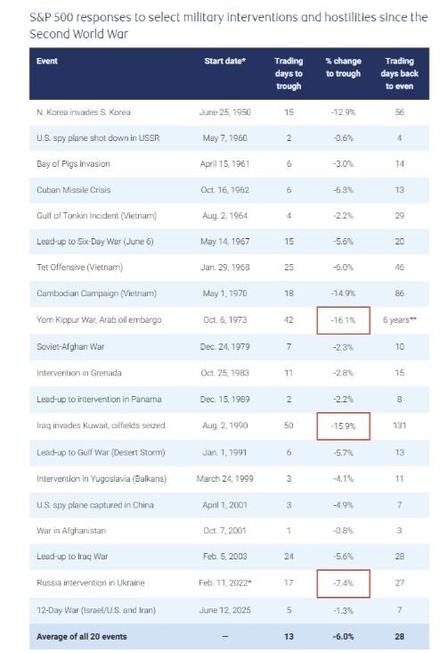 Сейчас много обсуждений вокруг конфликта на Ближнем Востоке и его влияния на рынки. Часто звучит тезис: «началась война — значит рынки должны падать». Исторически это не всегда так. По данным RBC Wealth Management, если посмотреть на 20 крупнейших военных конфликтов после Второй мировой войны: 🔻среднее падение S&P 500 составило около −6%