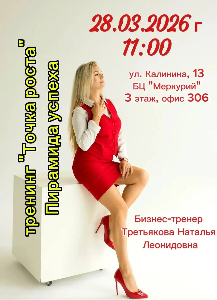 ! 🚀 Когда: 28 марта (суббота) в 11:00 Где: БЦ «Меркурий», ул. Калинина, 13, каб. 306 Приглашаем на мощный бизнес-тренинг «ТОЧКА РОСТА» 🚀 🎤 Ведущий спикер: Бизнес-тренер ТРЕТЬЯКОВА НАТАЛЬЯ ЛЕОНИДОВНА 🔺 КЛЮЧЕВАЯ ТЕМА ТРЕНИНГА: «ПИРАМИДА УСПЕХА» Разберем пошаговую структуру построения стабильного дохода и личной эффективности. Узнаем, как выстроить свою стратегию так, чтобы двигаться только вверх. На тренинге вы: ✅ Измените взгляд на привычные бизнес-процессы ✅ Поймете, как управлять своими ресурсами и временем ✅ Получите инструменты для масштабирования результата 🎯 Управляй своей жизнью — БУДЬ СОБОЙ! 🫶 Ждем вас в кругу единомышленников KН1😉