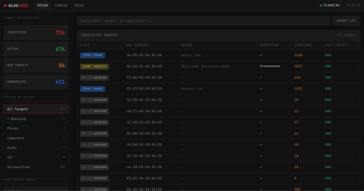 Π‘ΠΊΠ°Π½Π΅Ρ Bluehood Π½Π΅ΠΏΡΠ΅ΡΡΠ²Π½ΠΎ ΡΠΊΠ°Π½ΠΈΡΡΠ΅Ρ Π±Π»ΠΈΠΆΠ°ΠΉΡΠΈΠ΅ ΡΡΡΡΠΎΠΉΡΡΠ²Π°, ΠΈΠ΄Π΅Π½ΡΠΈΡΠΈΡΠΈΡΡΠ΅Ρ ΠΈΡ