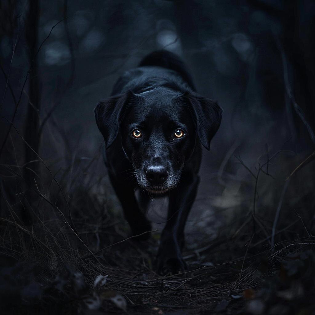 Осенью, когда природа погружается в сон, а земля покрывается слоем пожухлой травы, молодой человек Петр отправился на гуляшки в соседнюю деревню. Солнце село рано, погрузив мир в густую тьму. Лишь редкие звёзды робко выглядывали сквозь плотные облака, освещая путь Петра тусклым, обманчивым светом. Дорога вела через старый сосновый бор, чьи ветви сплетались высоко над головой, создавая ощущение замкнутого пространства. Сначала Петр наслаждался покоем лесной чащи, слушая шум листьев и свист ветра. Но вскоре его внимание привлекло подозрительное движение позади. Тихий стук когтей по влажной земле нарушил покой ночной прогулки. Обеспокоенно повернувшись назад, Петр застыл от ужаса. За ним следовала огромная чёрная собака, скользившая между стволами деревьев легко и беззвучно. Её мех сливался с мраком ночи, а красные глаза сияли подобно уголькам адского пламени. Взгляд существа выражал угрозу и ненависть, вызывая панику в душе юноши. Петр ускорил шаги, пытаясь убежать от невиданного зверя,