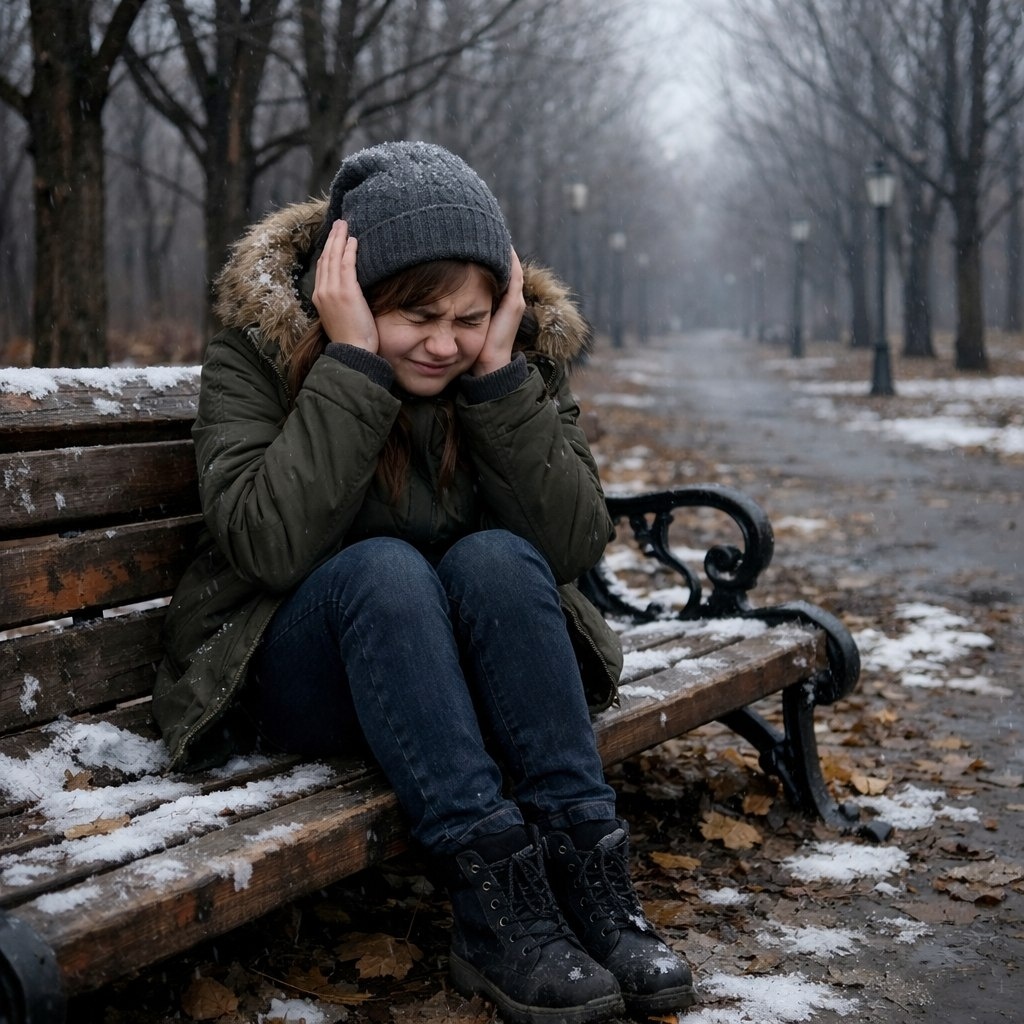 Внезапно внимание юной ведьмы привлекла сидящая на лавке молодая девушка, почти подросток. Она сидела, зажав руками уши и крепко зажмурив глаза и мотала головой.