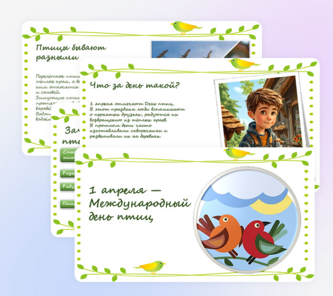 «День птиц». Презентация для младших классов с викториной (интерактивная). Тип материала: презентация. Роль материала: для проведения внеклассного занятия, посвящённого международному дню птиц; для закрепления знаний о перелётных и зимующих птицах, их роли в природе и способах помощи пернатым. Материал подходит для работы в начальной школе (1–4 классы) на классном часе, уроке окружающего мира, а также для занятий в системе дополнительного образования и внеурочной деятельности. Презентация оформлена ярко, содержит крупные иллюстрации, доступные тексты и интерактивные элементы: викторина снабжена переходами по внутренним ссылкам, что позволяет легко перемещаться между вопросами и слайдами-отгадками, делая занятие динамичным и увлекательным. Общее количество слайдов — 20. Содержание включает титульный слайд, краткую историю праздника, сведения о пользе птиц, знакомство с перелётными, зимующими и водоплавающими видами, подборку интересных фактов (длина языка дятла, способность ласточек пит
