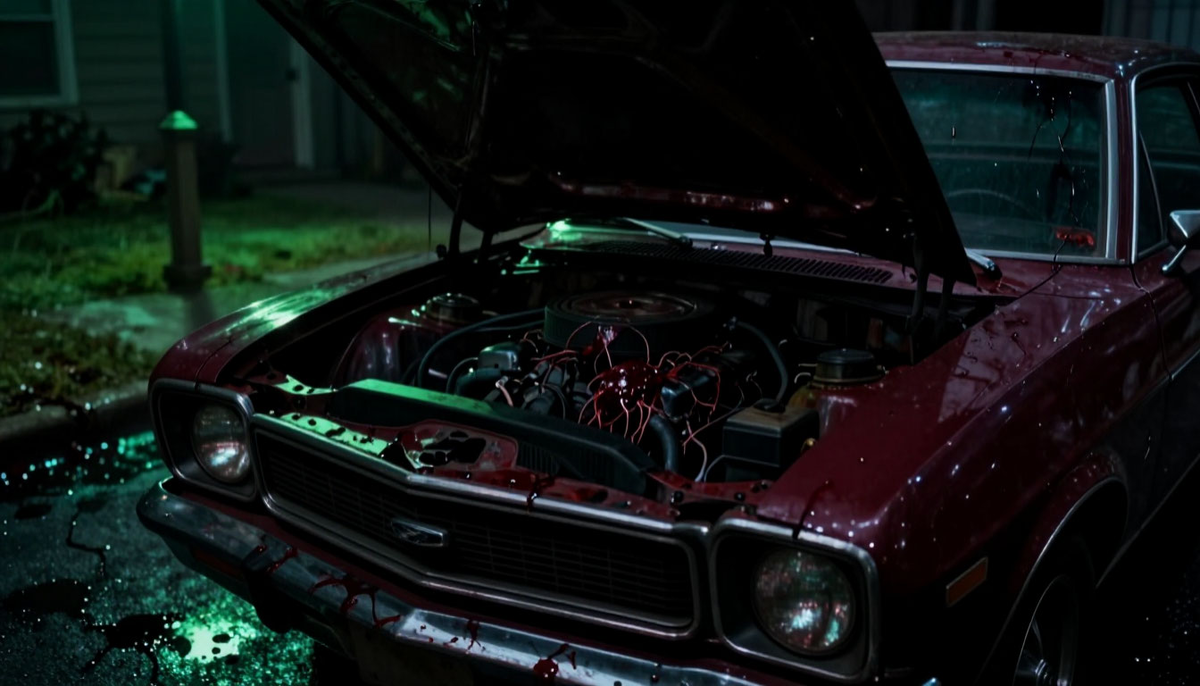 Утром машина выглядела почти нормально. Чуть более блестящей, чуть более… удовлетворённой. Во дворе не осталось следов борьбы. Только капля крови на асфальте — тёмная, вязкая, словно масло. И слабый запах гнили, который быстро развеял ветер.