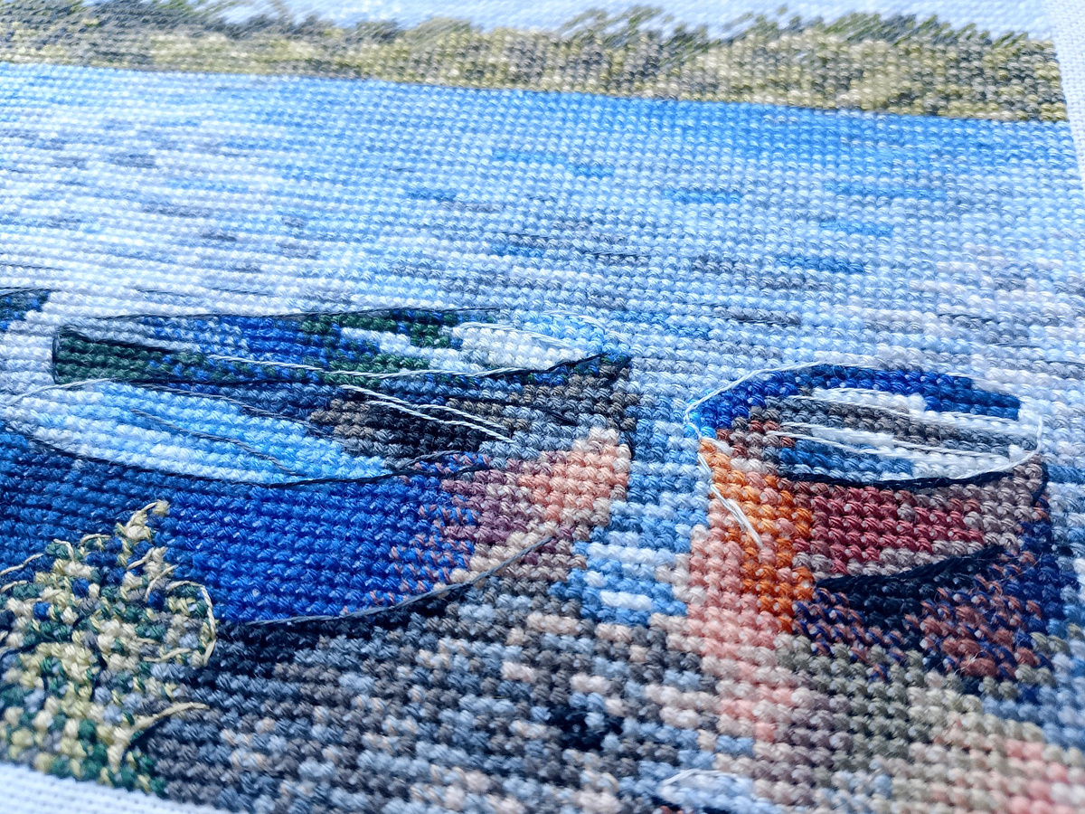 Первым объектом для подбора стала средняя лодка, так как в ней есть не просто чёрный цвет, но и полный серый градиент, к которому у меня ещё и нашлись нитки по ключу. Вышиваю маленькую область, сравниваю с фото отшива: нравится — оставляю, не нравится — думаю, в какую сторону скорректировать оттенок (светлее, темнее, синее…), распарываю и примеряю другой оттенок. Все пробы записываю в тетрадь карандашом, не подошедшее стираю. И так до победного конца. ¯\_(ツ)_/¯