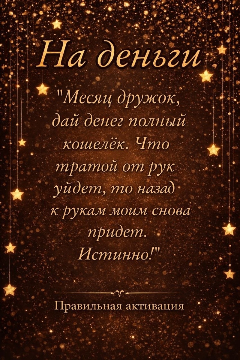 ✨ Чтобы практика действительно работала, важно не просто прочитать слова… а включиться в процесс. Вот как правильно активировать: 🔸 Найдите спокойное место, где вас никто не отвлекает 🔸 Сконцентрируйтесь на своём состоянии — уберите спешку и тревогу 🔸 Прочитайте текст вслух или про себя 3 раза 🔸 Представьте, как деньги приходят к вам легко и регулярно 🔸 В конце обязательно скажите: «Истинно. Благодарю.» 👆👆👆👆👆 Не делайте это «на автомате». Деньги идут туда, где есть внимание и энергия. 🌙 БЛАГОПРИЯТНЫЕ ДНИ ДЛЯ УСИЛЕНИЯ ЭФФЕКТА: ✨ Полнолуние — максимальная сила притяжения ✨ Растущая Луна — для увеличения дохода ✨ Четверг (день Юпитера) — энергия расширения и финансов ✨ 8, 17, 26 числа — денежные вибрации 💰 Если хотите усилить результат — повторяйте практику несколько дней подряд или в один и тот же день каждого лунного цикла. И главное — делайте это с ощущением, что у вас уже есть поток, а не с позиции нехватки. Напишите в комментариях: БЛАГОДАРЮ ❤️ — для активации в