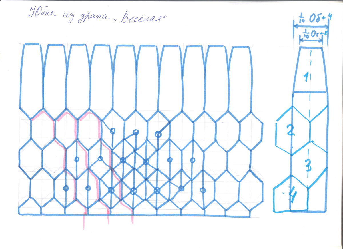 Сделайте выкройку одного клина юбки. Разрисуйте клин юбки на детали. Сделайте лекала деталей с учётом ширины обвязки. Сделайте раскрой деталей. Пробейте дырочки по периметру деталей и обвяжите детали. Обратите внимание, что шестиугольники можно собрать из более мелких деталей. Острые углы всегда надо избегать. Готовые детали соединяйте иголкой с ниткой, с лица, за обе полупетли. По нижнему краю юбки сделайте общий ряд столбиками без накида и "рачий шаг". Верхний край юбки обработайте под резинку. Если широкая резинка будет в цвет юбки, то можно будет взять ряд столбиками с тремя накидами, провязывая столбики то перед замкнутой резинкой, то за ней.