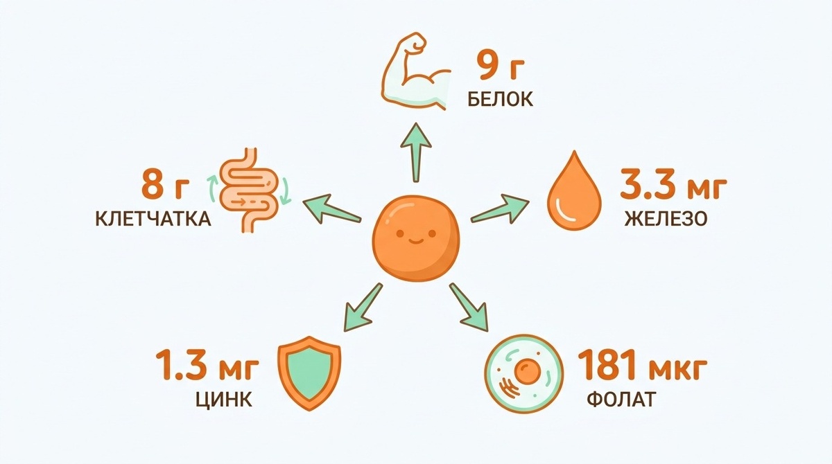 Железо: 3.3 мг. Это почти четверть дневной нормы для женщины. И это негемовое железо (растительное), но если есть чечевицу с лимоном или болгарским перцем, витамин С увеличивает усвоение в два-три раза.
