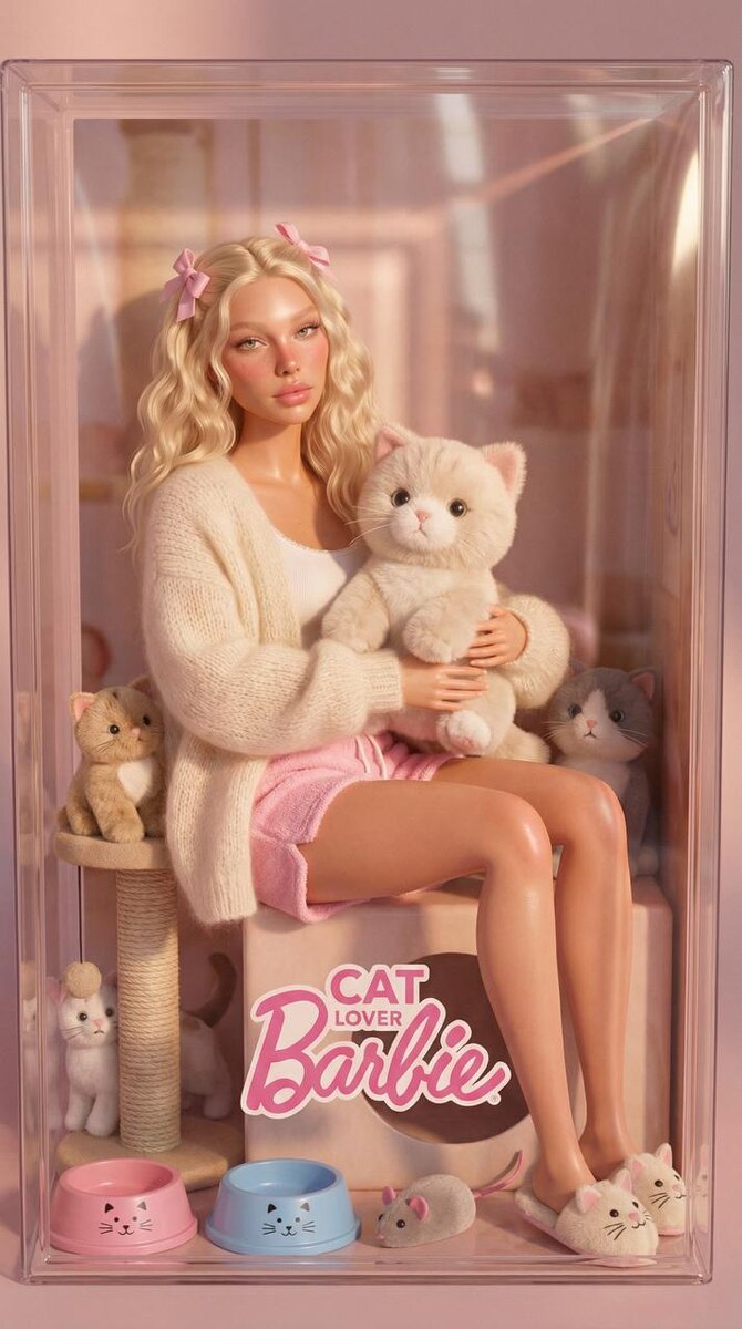 ✨✨✨✨✨✨ ИНСТРУКЦИЯ для генерации такого фото 📸: ✨зайди в бот https://t.me/aibudka_bot ✨ отправь свое фото в бот (лицо чётко видно) ✨ выбери Nano Banana Pro (обязательно ставь ползунок на pro для топ результата 🔛) ✨ параметры: 2K или 4К, 9:16 ✨ скопируй и вставь этот промпт: Не меняя внешности женщины, образ как изящная кукла в коробке, ожившая Барби в пастельных тонах интерьера. Она сидит на маленьком светлом диванчике, поза спокойная, тело немного повернуто к камере, взгляд вперёд, мягкий и мечтательный. Мягкий свет подчеркивает блеск кожи и румянец на щёках, создавая тёплые полутона. Светлые волнистые волосы украшены двумя розовыми бантиками. На ней кремовый объёмный кардиган из пушистого мохера поверх белого топа и нежно-розовые шорты из махровой ткани, контрастирующие с гладкой кожей голых ног. Тапочки с мордочками котиков добавляют уют и игривость. В руках большой плюшевый котёнок бело-бежевых оттенков, вокруг — несколько плюшевых котиков разных цветов. Рядом когтеточка с канат