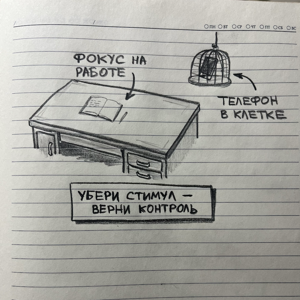 Весь вечер пялишься в телевизор или телефон кажется отдыхом. Утром ты встаешь разбитым, весь день работаешь на износе, а вечером снова нет сил ни на что, кроме как опять уткнуться в экран. Как разорвать замкнутый круг? Не надо бороться с собой. Надо уменьшить стимул. Если ты не видишь соблазна, тебе не нужно тратить силы на сопротивление. Практические примеры. Смартфон и работа.