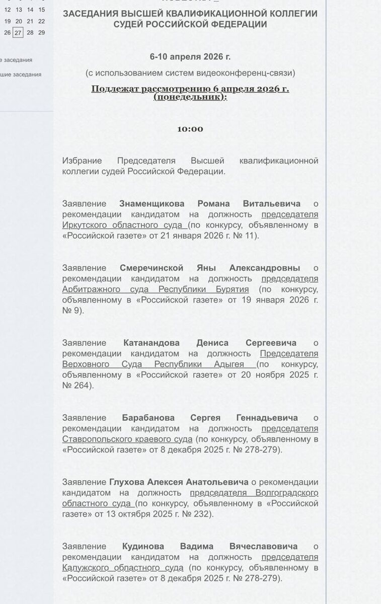 👨🏻⚖️ 6 апреля ВККС России рассмотрит заявление Кудинова Вадима Вячеславовича о рекомендации кандидатом на должность председателя
