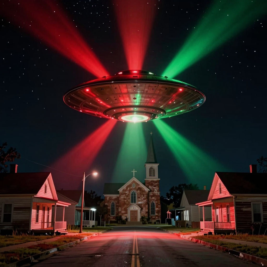 Было около 22:00, когда небо над Ред‑Ривером вдруг озарилось странным светом. Сначала это выглядело как обычная зарница — далёкие вспышки на горизонте. Но свет становился всё ярче, а вспышки — чаще. Вскоре стало ясно, что это не гроза. В небе появилось огромное дискообразное тело, испускавшее пульсирующие лучи красного и зелёного цвета. Объект медленно двигался над городом, словно сканируя его.