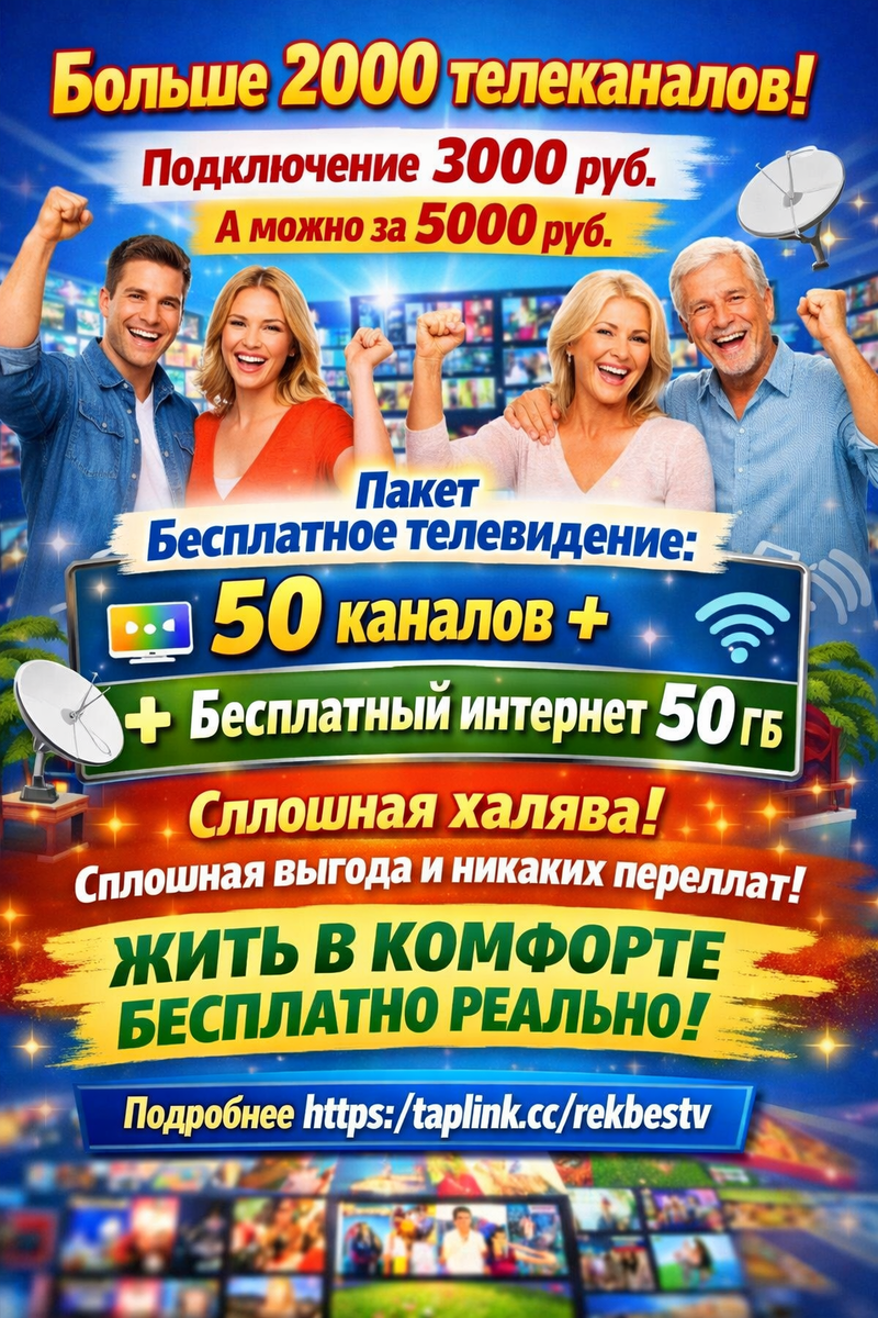 В эпоху, когда каждый второй ищет в интернете «2000 каналов бесплатно без антенны» или «бесплатное телевидение без ежемесячных платежей», наконец появилось реальное решение, которое полностью меняет правила игры. Представьте: вы подключаете бесплатное телевидение с более чем 2000 телеканалов и платите всего 3000 рублей один раз за подключение, а дальше наслаждаетесь просмотром за 0 рублей в месяц навсегда. Никаких скрытых абонентских плат, никаких сюрпризов в квитанциях – только чистое удовольствие от тысяч каналов со всего мира прямо у вас дома. Это не фантазия, а действующий тариф, который уже помогает тысячам семей экономить тысячи рублей каждый месяц и смотреть любимые фильмы, сериалы, спорт, новости и детские передачи в отличном качестве. Но и это еще не всё! Для тех, кто хочет получить комплексное решение, существует второй супервыгодный тариф: бесплатное телевидение на 50 каналах плюс бесплатный интернет объемом 50ГБ каждый месяц. Подключение такого пакета обойдётся всего в 5000