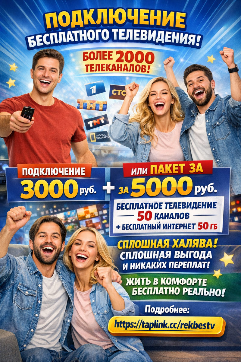 В эпоху цифровых технологий каждый хочет получать максимум развлечений за минимальные деньги и именно поэтому бесплатное телевидение с более 2000 телеканалов за 0 рублей в месяц стало реальностью для всех желающих этот уникальный тариф позволяет наслаждаться любимыми программами без ежемесячных платежей а подключение обойдется всего в 3000 рублей один раз и навсегда благодаря такому предложению бесплатное телевидение теперь доступно каждому кто ищет выгоду и качество в одном флаконе. Кроме того существует еще один привлекательный вариант для тех кто нуждается не только в телевидении но и в интернете тариф с бесплатное телевидение на 50 каналов и бесплатный интернет объемом 50ГБ ежемесячно подключение по этому тарифу стоит 5000 рублей что является отличной инвестицией в комфорт вашей семьи многие пользователи уже оценили выгодный тариф и рекомендуют его друзьям за стабильность сигнала и разнообразие контента. Не упускайте шанс изменить свое телевизионное пространство к лучшему с помощью