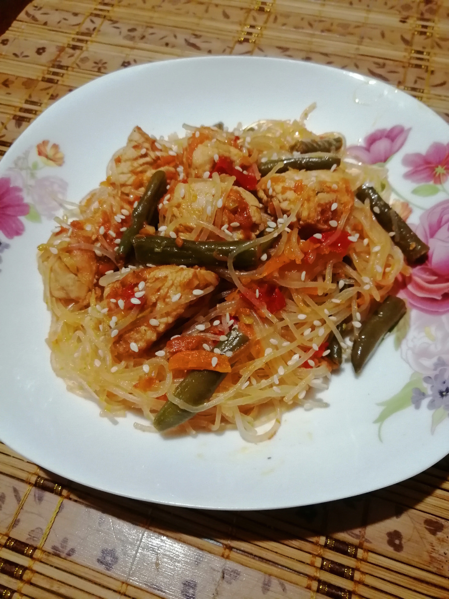 ФУНЧОЗА с индейкой/курицей(в пост можно без)и с тонкой соломкой овощей.😋
