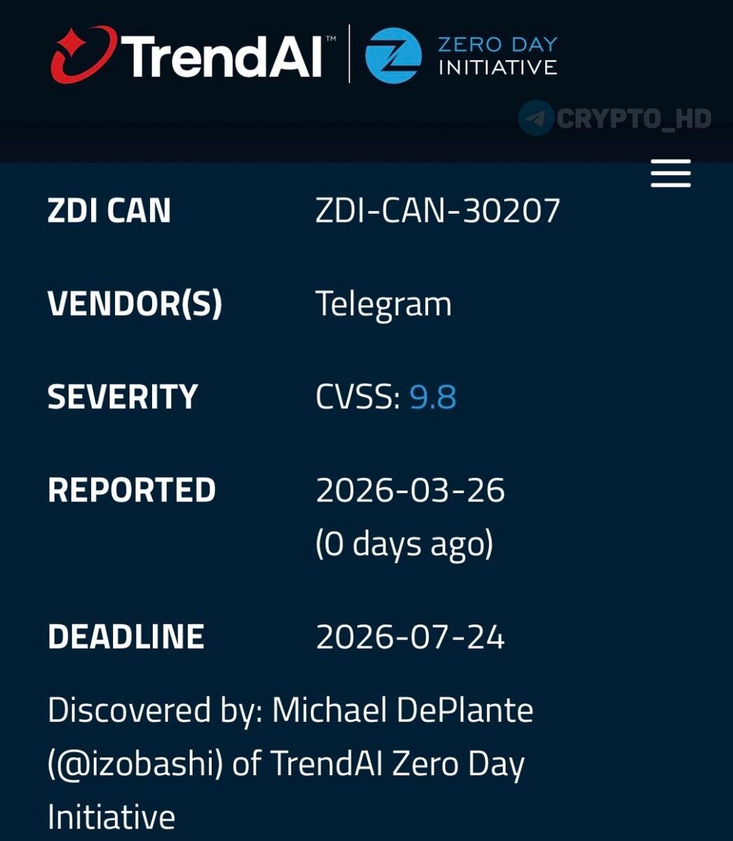 ❌✈️ В Telegram нашли критическую уязвимость… В базе Zero Day Initiative появилась запись о критической уязвимости Telegram: ➥ Реестровый номер: ZDI-CAN-30207. ➥ Оценка опасности: 9,8 из 10 по шкале CVSS (почти максимум). Для сравнения: 9,8 означает, что хакер может атаковать издалека, без пароля, без привилегий и без участия (❗️) пользователя. У команды разработчиков есть 120 дней на исправление – до 24 июля 2026. Если за это время не выпустят фикс, информацию о баге выложат в открытый доступ. Zero Day Initiative – одна из самых авторитетных программ по поиску уязвимостей. Crypto Headlines