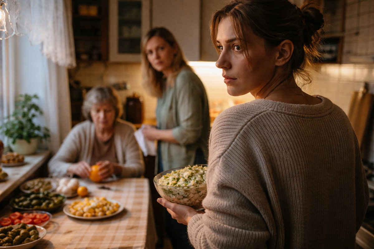 Я вдруг очень ясно увидела картину со стороны. Я стою с миской салата, с мокрым рукавом, с лицом, которое, наверное, уже плывет от усталости. На плите еще бурлит картошка для пюре. В ванной сохнет отстиранная скатерть, потому что запасную Лена забраковала - "слишком простая". В комнате Галина Ивановна листает рекламную газету, даже не спрашивая, не нужна ли мне помощь. А Лена, с идеально уложенной челкой и свежим маникюром, говорит мне почти с нежностью, что я зря стараюсь.