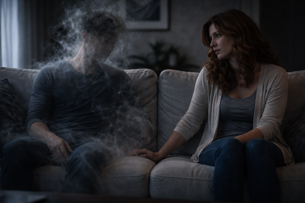 Он физически присутствует. Но эмоционально — далеко. Он смотрит на тебя, но не видит. Говорит, но не слышит.