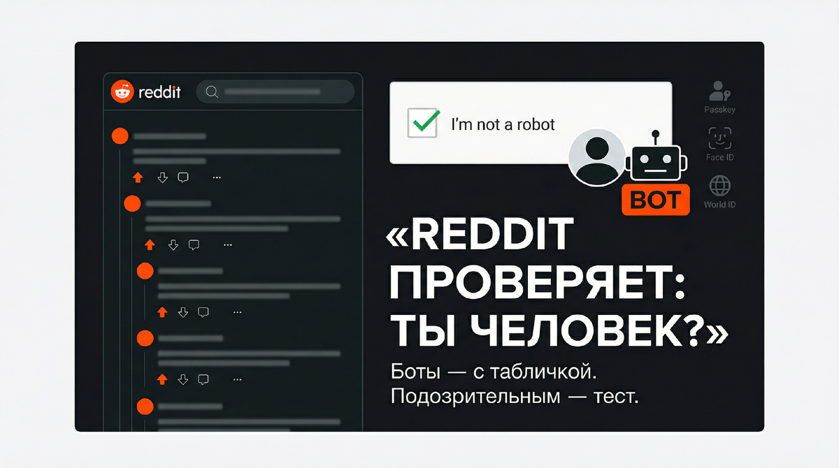 Ты, наверное, замечал странные аккаунты: пишут слишком быстро, отвечают слишком гладко, а в обсуждении ведут себя как продавец пылесосов на остановке. Reddit тоже заметил — и решил с этим что-то сделать. Теперь платформа будет отмечать «полезных ботов» и просить подозрительные аккаунты доказать, что за ними стоит живой человек, а не скрипт с плохим настроением. На Reddit много автоматических аккаунтов, которые реально помогают: напоминают правила, собирают ссылки, делают сервисные вещи. Теперь такие аккаунты получат специальную маркировку — по смыслу это «да, я бот, но я по делу». Чтобы обычный пользователь не играл в угадайку: перед ним помощник или очередной «эксперт», который за минуту успевает ответить в двадцати тредах. Важно: это не тотальная верификация для всех. Никто не говорит «сначала паспорт, потом мемы». Проверка включится только если Reddit увидит нечеловеческое поведение: аккаунт пишет с нереальной скоростью, постит без пауз, оставляет следы в данных. Если проверку не пр