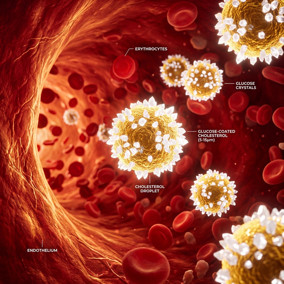 При хронически высоком уровне сахара в крови происходит процесс неферментативного гликирования. Молекулы глюкозы «прилипают» к белкам, в том числе к белкам, входящим в состав липопротеинов. Гликированные ЛПНП не распознаются рецепторами печени и дольше циркулируют в крови, что резко увеличивает их шансы осесть на стенках артерий. Более того, гликированию подвергается и коллаген в стенках сосудов, что делает их более жесткими и восприимчивыми к повреждениям.