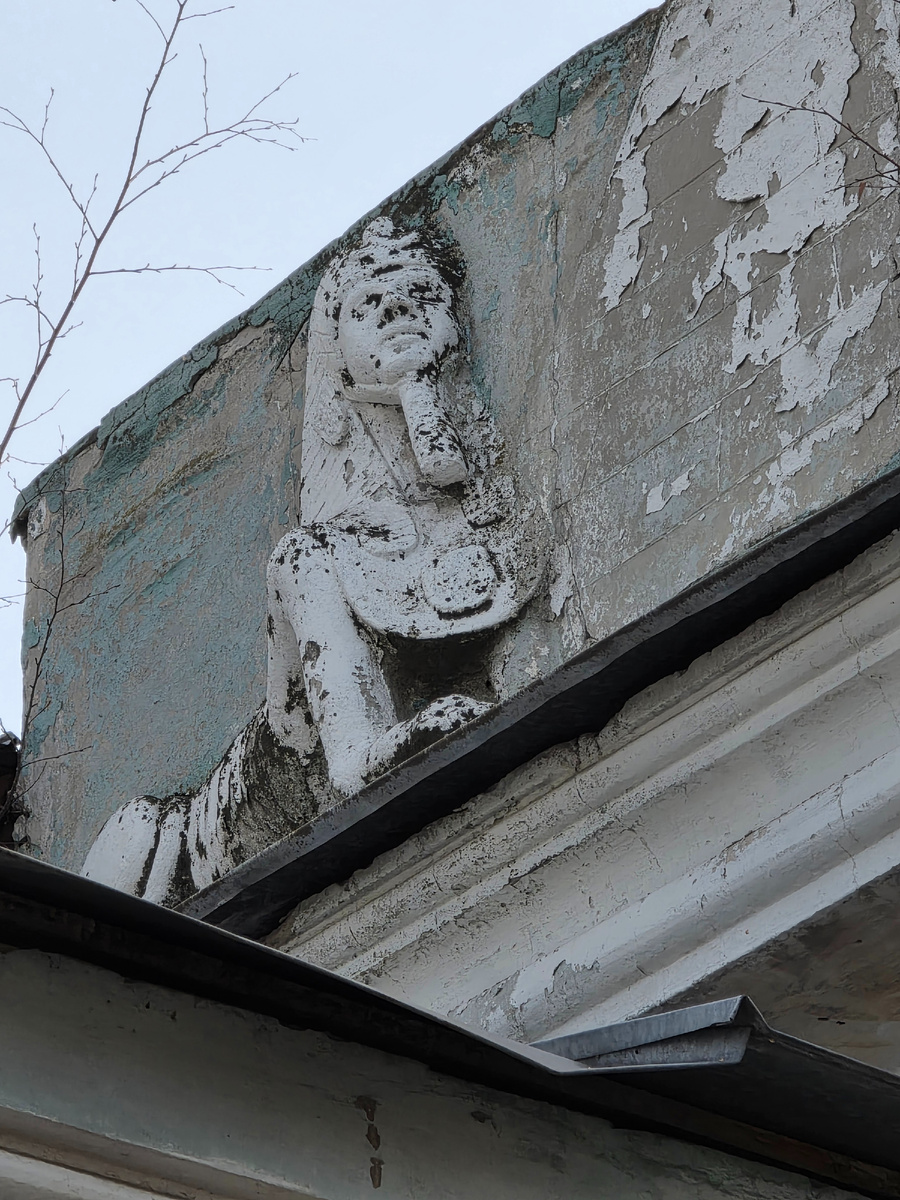 Дом купца Ревякина окутан легендами. Лепной декор с дельфинами, а ещё и на аттике, над входной группой, барельеф таинственного Сфинкса с женской головой и египетские пирамиды.