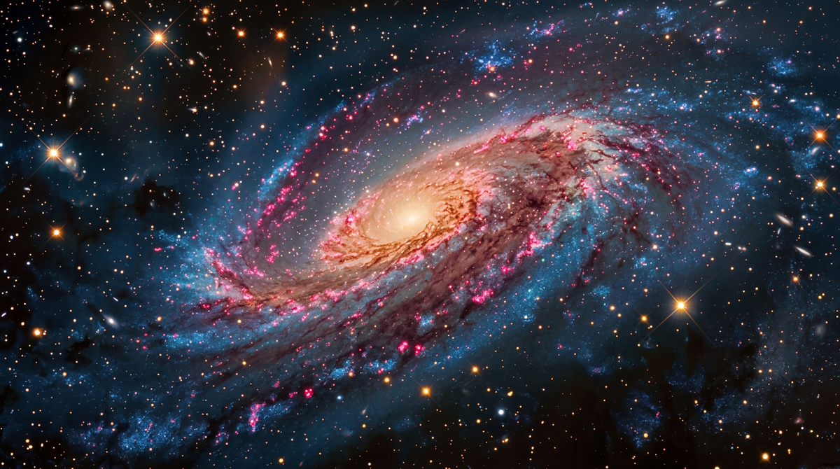 Вы когда-нибудь задумывались, откуда учёные знают, как выглядит наша галактика? Ну, знаете, этот красивый плоский диск с закрученными спиральными рукавами, который красуется во всех учебниках, научно-популярных фильмах и даже на обоях телефонов. Я тоже не задумывался. Пока однажды не узнал правду. Оказывается, то, что мы привыкли называть «видом Млечного Пути»… это не Млечный Путь. Звучит как теория заговора? Но это чистая наука. Если вы откроете любой учебник астрономии или статью о нашей галактике, вы увидите примерно одно и то же: плоский диск, спиральные рукава, яркое ядро. Красиво, внушительно, похоже на огромный космический ураган. Но это не фото Млечного Пути. Это снимок галактики Мессье 74 (M74). Она находится в созвездии Рыб на расстоянии около 30 миллионов световых лет от нас. И она действительно очень красивая. Ответ до смешного прост: мы не можем сфотографировать свою галактику снаружи. Представьте, что вы стоите внутри огромного дома и пытаетесь сделать его фотографию