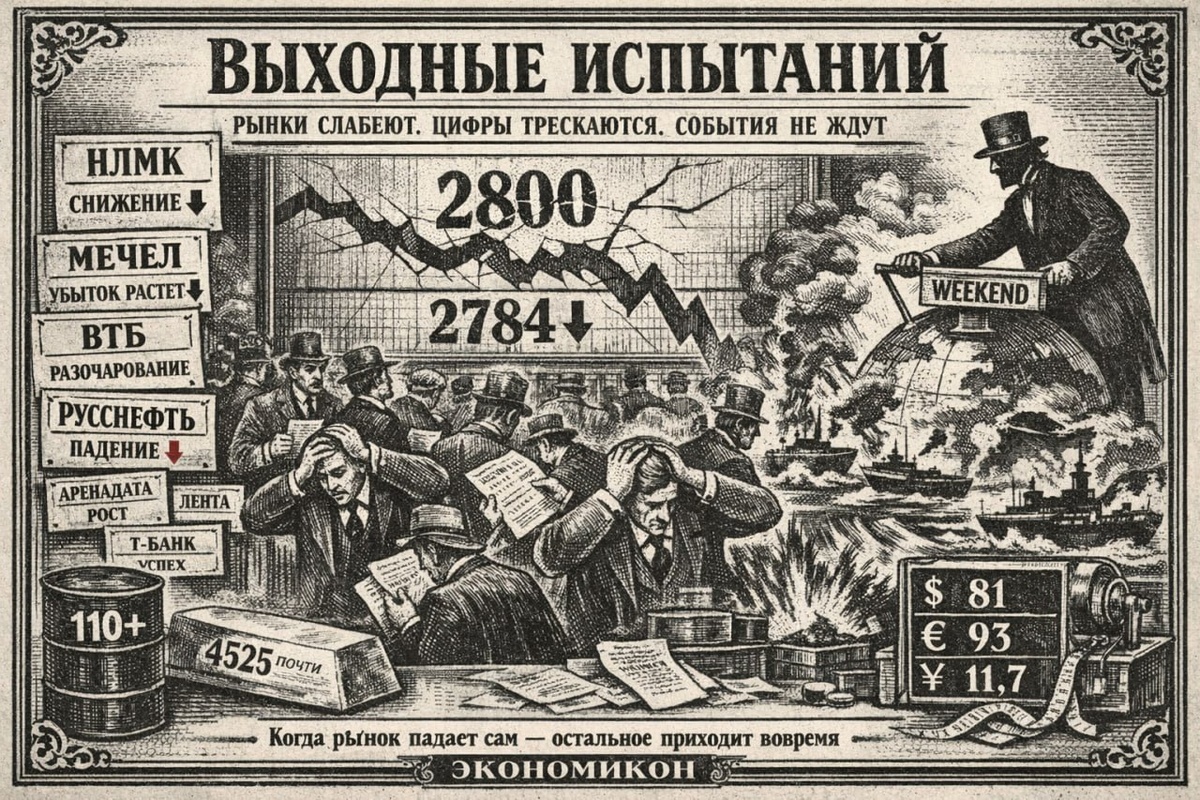! Неделя пронеслась довольно быстро, индекс потерял 2,8% опустившись к 2784 пунктам, 2800 прошли, как сквозь масло. Неделя была полна событий: акционеры ЮГК вчера ликовали, постановлением ведущего судебного пристава-исполнителя УИОИП от 25.03.2026 были отменены отменены меры принудительного исполнения, бумаги закончили неделю с ростом в 5,5%. Продолжает выходить отчетность, отчиталась НЛМК, показатели по МСФО за 2025 год скажем так, не радуют. Выручка ₽831,3 млрд (-15,1% г/г), чистая прибыль ₽63,15 млрд (снижение в 1,9 раза г/г). То, что есть чистая прибыль уже хорошо, не всем металлургам так везет, хотя бумаги просели на 2,2%. ХэХэРу отчитался тоже не очень, выручка подросла на 4% г/г и составила ₽41,20 млрд, а вот чистая прибыль снизилась в 1,3 раза до ₽17,99 млрд. Мечел отчитался по МСФО за 2025 год, выручка составила ₽286,9 млрд (-25,9% г/г) убыток составил ₽79,76 млрд против убытка ₽36,27 млрд годом ранее. Если убыток вырос, то это же и есть отрицательный рост? Чистая прибыль А