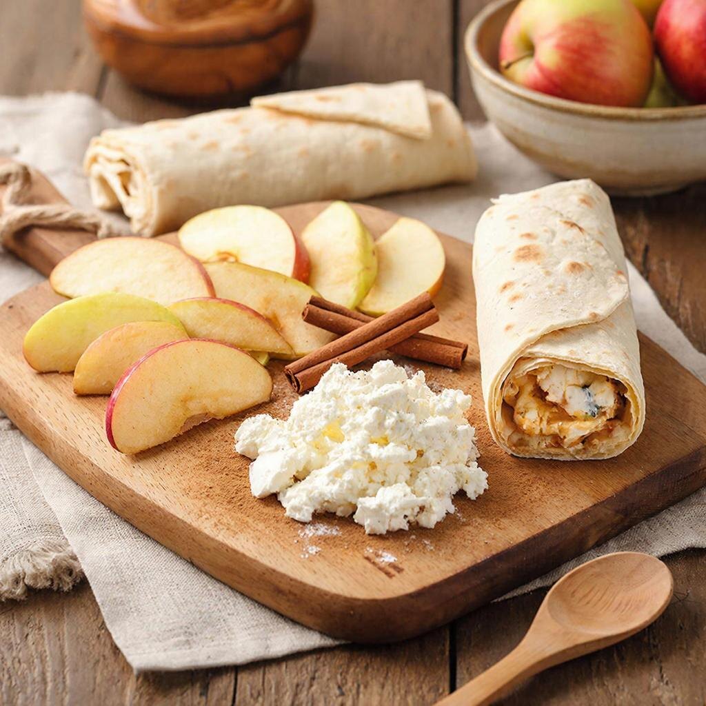Нам понадобится лаваш, разворачиваем его и кладем внутрь начинку из перемешанного 5% творога 200 гр с яйцом и 200 гр нарезанных фруктов.