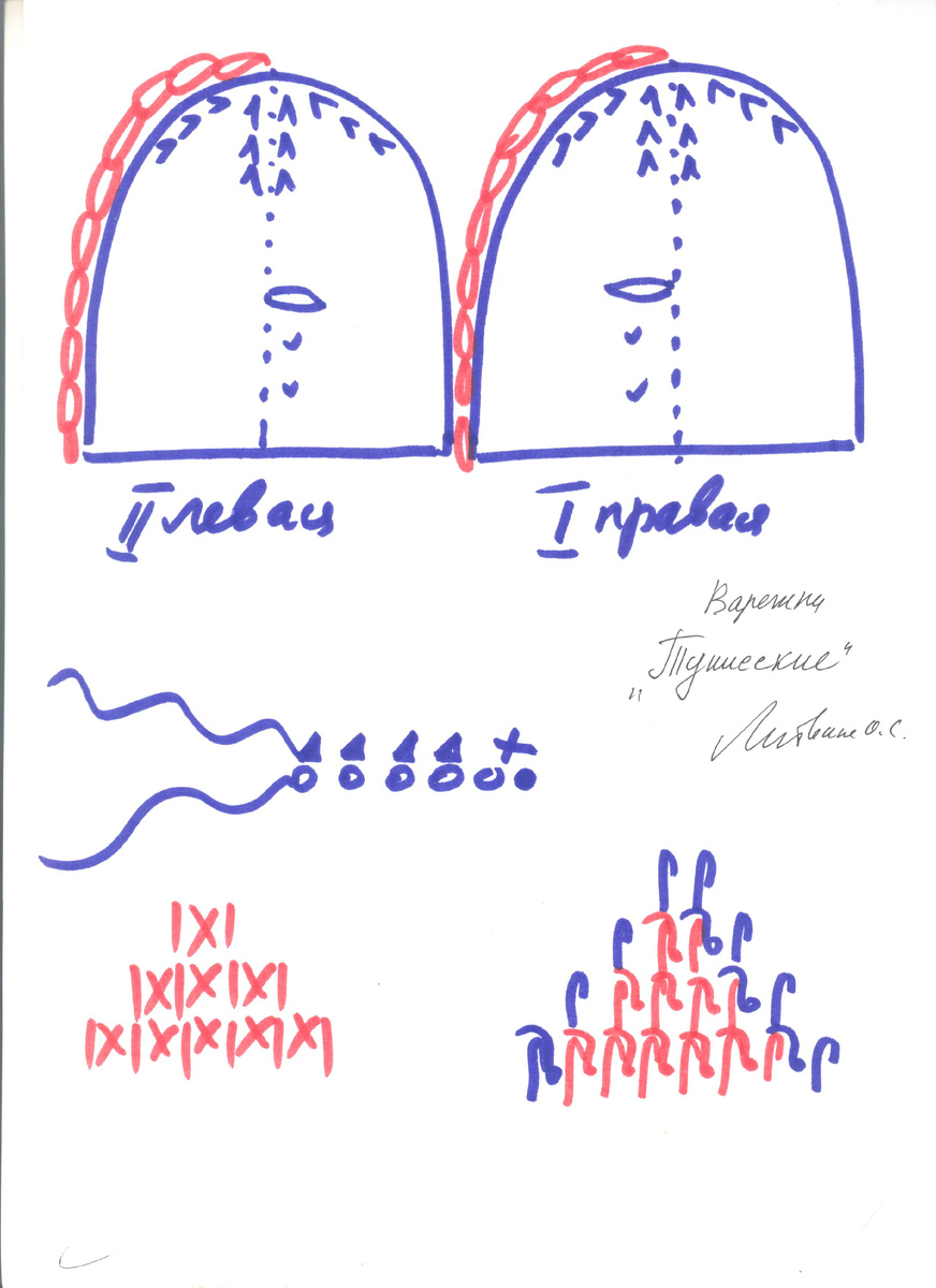 Вяжите варежки одним полотном, снизу вверх, в соответствии с выкройкой. Ширина полотна равна обхвату кисти. Большой палец по высоте занимает одну треть длины кисти. Провяжите одну треть длины кисти до отверстия большого пальца. Ниже отверстия на 2,0 - 2,5 см сделайте одну прибавку. Ширина большого пальца равна 1/4 обхвата кисти, минус 1 см. Представим, что ширина отверстия для большого пальца - 6 петель. Вы сделали одну прибавку, значит под отверстием будет семь петель. Наберите петли до середины, до сгиба. Достаньте одну наборную петлю и далее считайте семь полустолбиков. Над последним полустолбиком наборная петля на крючке. Набирайте остальные петли, затем провязывайте их над полустолбиками. Сделайте шесть воздушных петель и продолжайте провязывать наборные петли. Продолжайте вязание и дойдите до середины мизинца. Вяжите с убавками по две наборные петли вместе по
