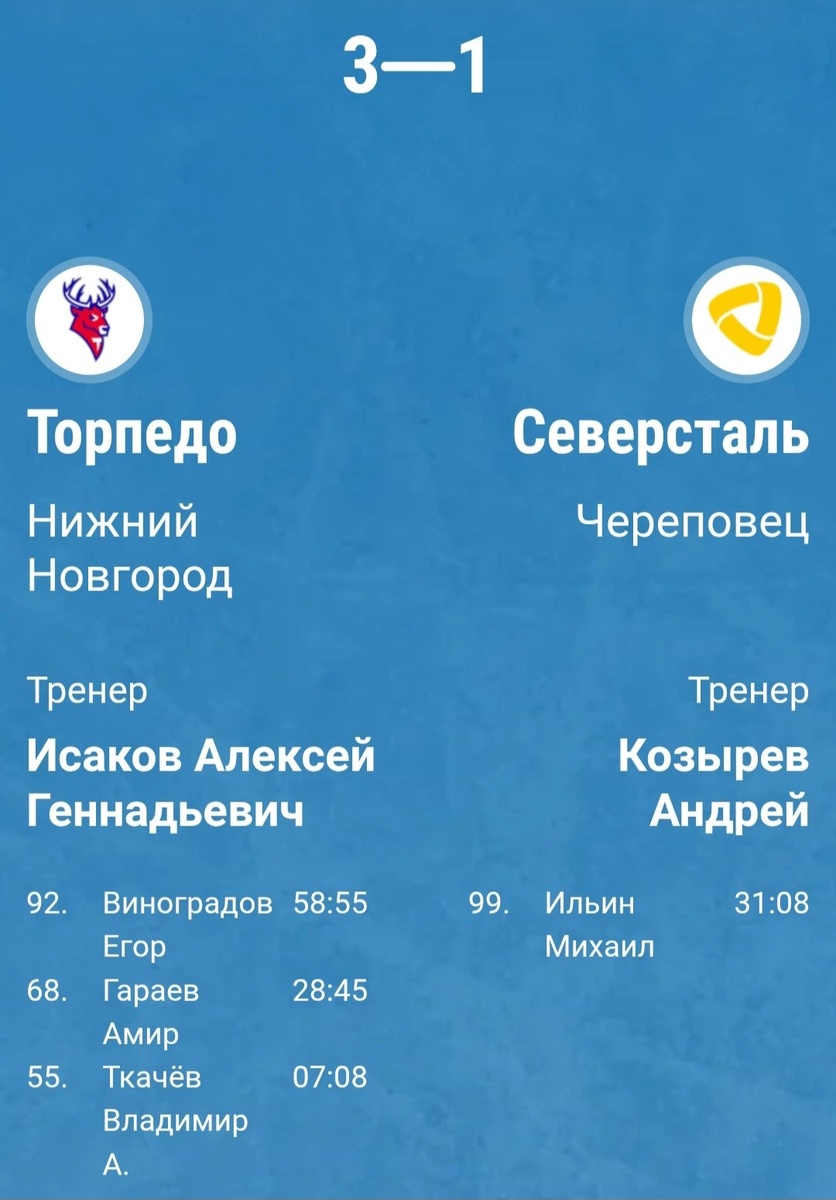 Череповчане неудачно начали нижегородскую часть первого раунда плей-офф, уступив "Торпедо" со счетом 1:3. Единственную шайбу "Северстали" забросил нападающий Михаил Ильин. Счет в серии стал 2:1 в пользу "Торпедо". В воскресенье команды снова сыграют в Нижнем Новгороде, а во вторник приедут в Череповец. Противостояние ведется до четырех побед. Речь ВКонтакте | Речь в МАКС | Речь в ОК | Речь в Дзене | 35MEDIA в МАКС