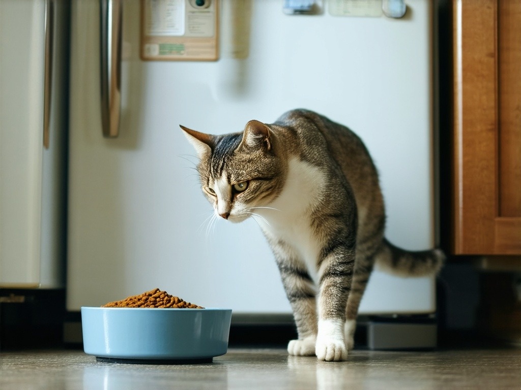 Кошке может не нравиться не корм, а место. Миска стоит слишком близко к проходу, рядом гудит холодильник, сзади ничего не прикрывает спину. Для нас просто кухня. Для неё почти сцена: всё шумит, звякает, кто-то ходит, кто-то может выскочить в любой момент.
