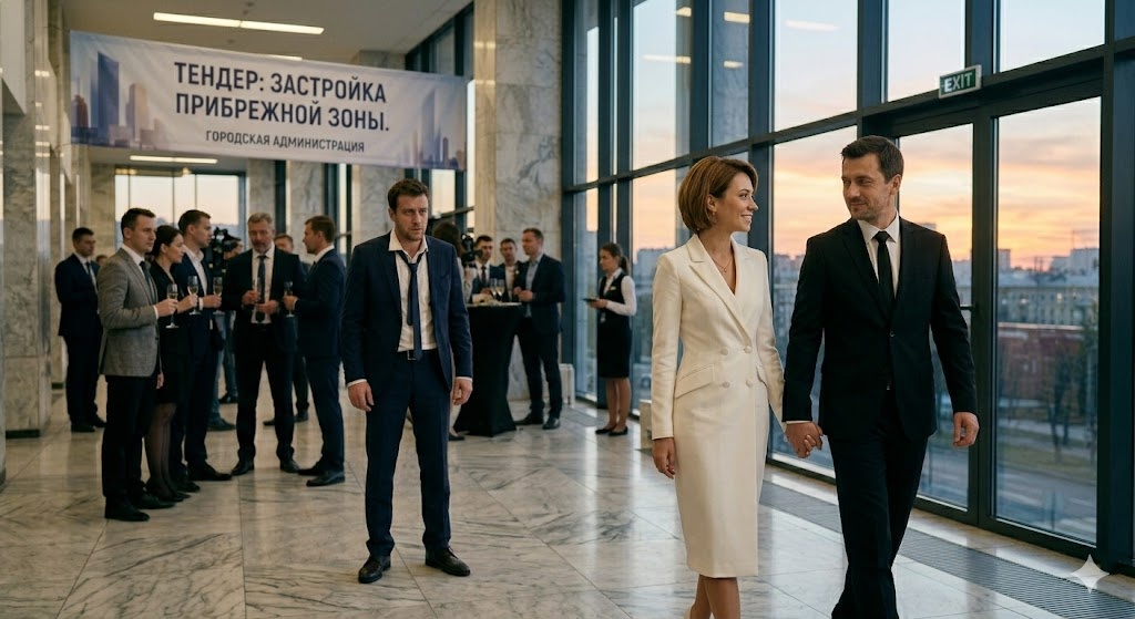 Конференц-зал мэрии был переполнен. Тендер на застройку прибрежной зоны решал судьбу многих компаний. Для Вадима победа была вопросом выживания — его фирма висела на волоске от банкротства, кредиторы обрывали телефоны, а Диана вчера собрала вещи и ушла к молодому фитнес-тренеру, заявив, что Вадим "сдулся".