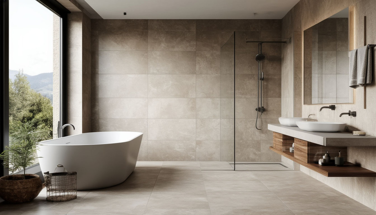 - Крупноформатная (60×120, 80×160, 120×240) — быстрее монтируется, меньше швов, создаёт ощущение монолитной поверхности. Но требует идеально ровного основания и опыта от плиточника.