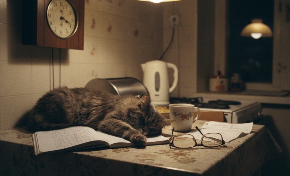 Барсик запрыгнул на стол, лёг на тетрадь. Валентина Григорьевна не согнала — пусть лежит. Тепло от кошачьего тела проходило через обложку. Странное ощущение — тепло поверх цифр, поверх долга в 1 340 000, поверх слова «банкротство».