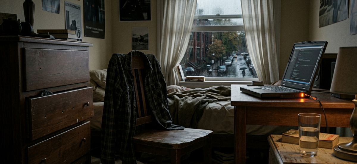 Комната была его. Вот комод с отвалившейся ручкой, вот стул, на котором висит вчерашняя рубашка — он помнил, как бросил ее именно так, рукавом на спинку, второй рукав на пол. Вот ноутбук на столе, индикатор зарядки мигает оранжевым. Вот окно, и за ним действительно дождь. Бостон. Октябрь. 2048 год. Все на своих местах.