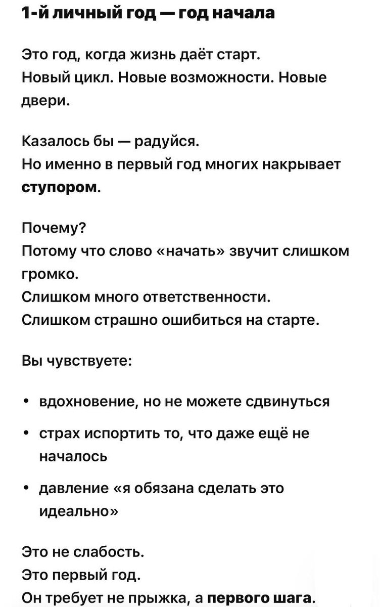 Просто цифры. В прошлом посте я спрашивала про страх перемен. Вы промолчали. И я поняла: молчание — это тоже ответ. Тоже честность. Иногда мы не готовы говорить вслух о том, что внутри🤍 Сегодня предлагаю другой язык. Нумерология говорит, что страх перед переменами часто связан не с тем, что мы какие-то не такие, а с тем, что мы не на своём пути. Или стоим на пороге важного личного года, но пока не знаем об этом. В нумерологии жизнь идёт 9-летними циклами. И каждый год имеет свою энергию, свою задачу, свой урок и свои страхи. 2026 год складывается в единицу: 2+0+2+6 = 10 → 1+0 = 1 Это значит, что мир, общество, общее поле находятся в точке старта. Открываются новые двери. Появляются возможности, которых не было 9 лет. Всё, что закладывается сейчас, будет развиваться следующие 9 лет. Но то, как вы будете это проживать, зависит от вашего личного года. И он может быть любым — от 1 до 9. И вот здесь происходит самое интересное. Это может быть старт, завершение или пауза. Напишите в