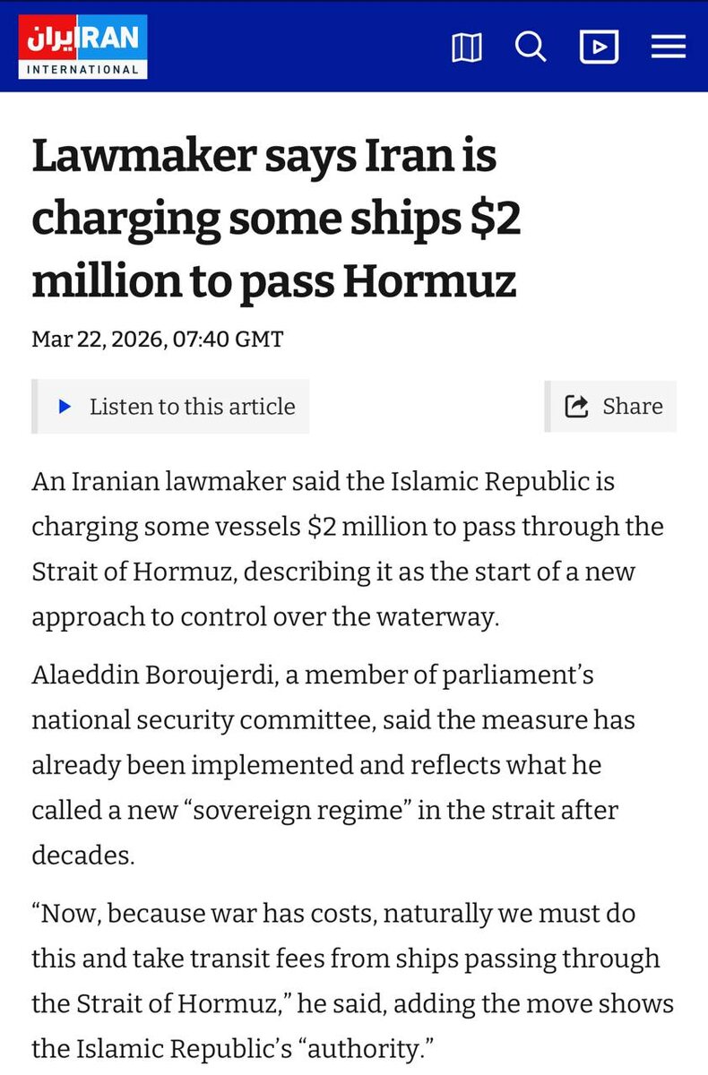 💰 Сообщение о якобы сборе $2 млн за безопасный проход через пролив распространяет Iran International — лондонское издание, известное антииранской линией и признанное в Иране экстремистским. Смысл вброса понятен: представить Тегеран как вымогателей на морском коридоре. Подпишитесь на канал
