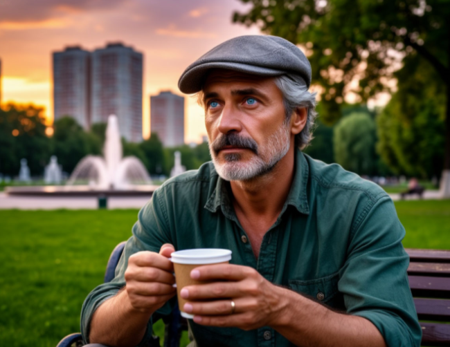 Мужчина присел на скамейку, медленно запрокинув голову назад, на встречу ласковому вечернему солнцу. В его голубых глазах, открытых и молодых, несмотря на прожитые годы, словно поселилась сама небесная синь.