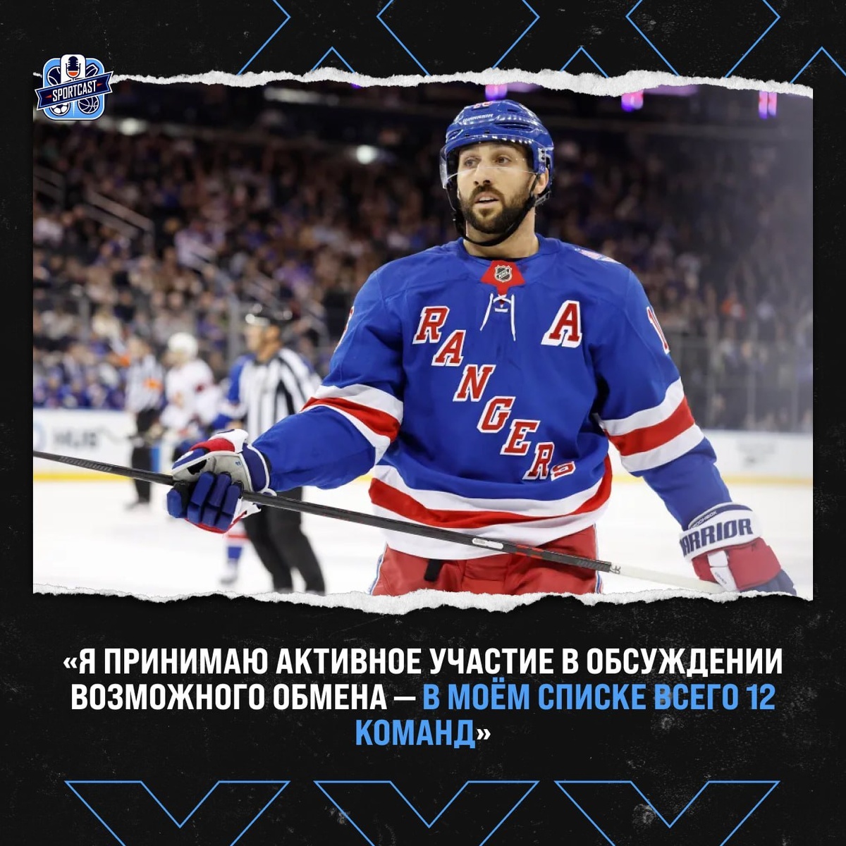 ». «Я стремлюсь присоединиться к сильной команде, которая находится в лучшем положении, чем «Рейнджерс». В мои 32 года для меня крайне важно побороться за Кубок Стэнли. К тому же, моя семья проживает на Восточном побережье, поэтому клубы Западной конференции не являются приоритетными вариантами. Я активно участвую в обсуждении своего обмена, у меня есть список из 12 команд. Отношения с Крисом Друри отличные, он всегда честен и держит меня в курсе событий».