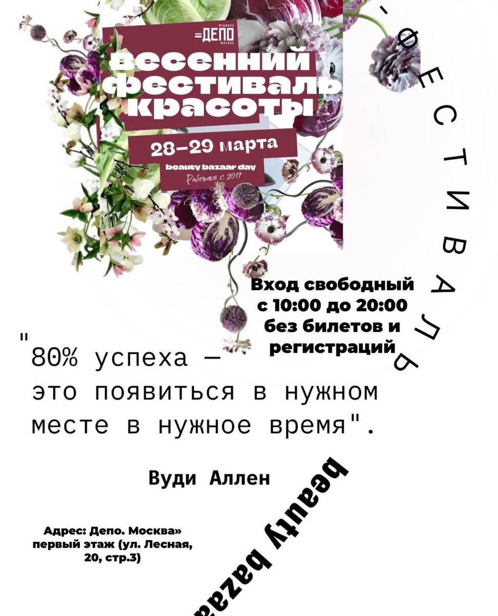 ! 🤍 28 и 29 марта в фудмолле «Депо.Москва» пройдёт яркий Весенний фестиваль красоты, и если вы давно хотели вдохновиться новыми образами, протестировать уход или просто провести день в бьюти атмосфере — это идеальный повод заглянуть! 🤌🏽✨ Здесь соберутся самые нашумевшие бренды страны — среди них 👉 MIVIXIL 🤩 Spark and Glow 🤩 MAD ONE 🏹 Что вас ждёт: 💄 бесплатный макияж на стенде 🎁 подарки от участников 👩⚕️ Консультация с трихологом 🌸 весеннее настроение и много бьюти-находок 📍 Адрес: фудмолл «Депо.Москва», первый этаж (ул. Лесная, 20, стр.3) ⏰ Время работы: с 10:00 до 20:00 🎟 Вход свободный — никаких билетов и регистраций! Приходите за вдохновением и красотой — весна уже здесь 💐✨