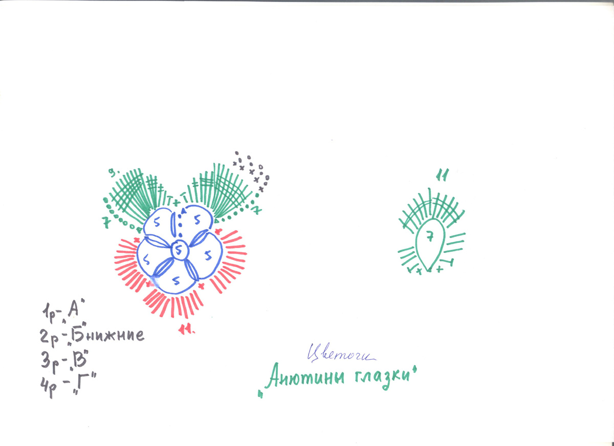 Для вязания этих цветочков вам потребуется по 10 гр. ниток "Ирис" четырёх цветов: "А", "Б", "В", "Г".
