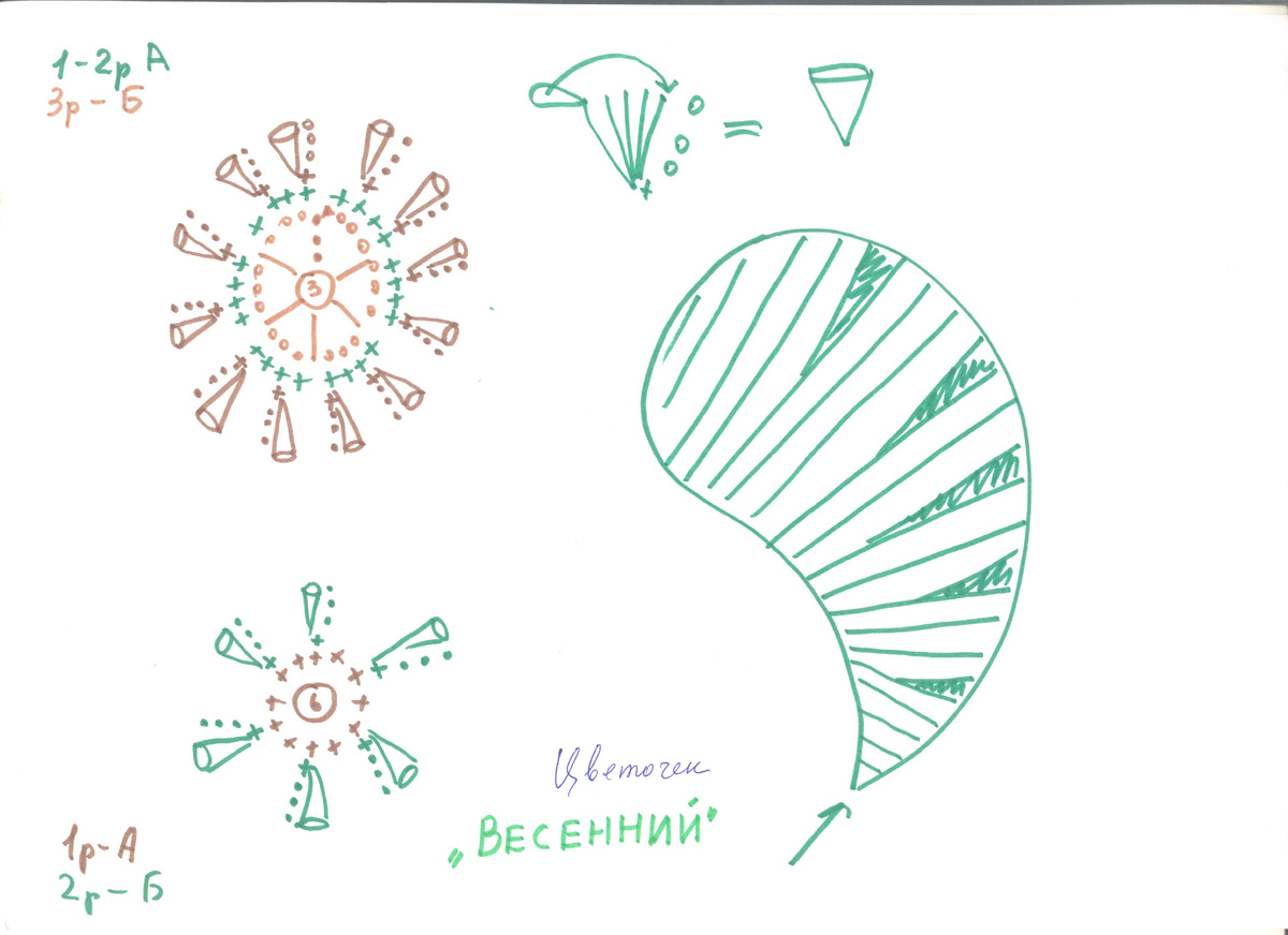 Свяжите маленькие и большие цветочки с "кулёчками" по схеме. Листочек вяжите столбиками без нак