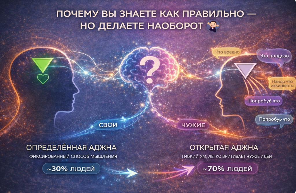 🤷 Решили питаться правильно. Прочитали статью, составили меню, купили продукты. Через три дня — пицца на ужин. И не потому что «нет силы воли». А потому что подруга рассказала про интервальное голодание — и вдруг правильное питание показалось бессмысленным. Потом кто-то в ленте написал, что углеводы — это нормально. И вот вы уже не понимаете, чему верить 😅 Знакомо? Сегодня одна концепция кажется правильной, завтра — противоположная. И обе звучат убедительно. В Дизайне Человека за это отвечает Аджна Центр — центр обработки мыслей и концепций. И устроен он у людей по-разному 👇 🟣 Определённая Аджна (~30% людей) — фиксированный способ мышления. Есть своя точка зрения, и сбить с неё сложно. «Я так считаю» — и точка. ⚪ Открытая Аджна (~70% людей) — гибкий ум, который легко впитывает чужие идеи. Рядом с уверенным человеком — тоже чувствуете уверенность в его идее. Рядом с другим уверенным человеком — уже в его. Проблема не в том, что вы «непостоянны». А в том, что чужие мысли ощущают