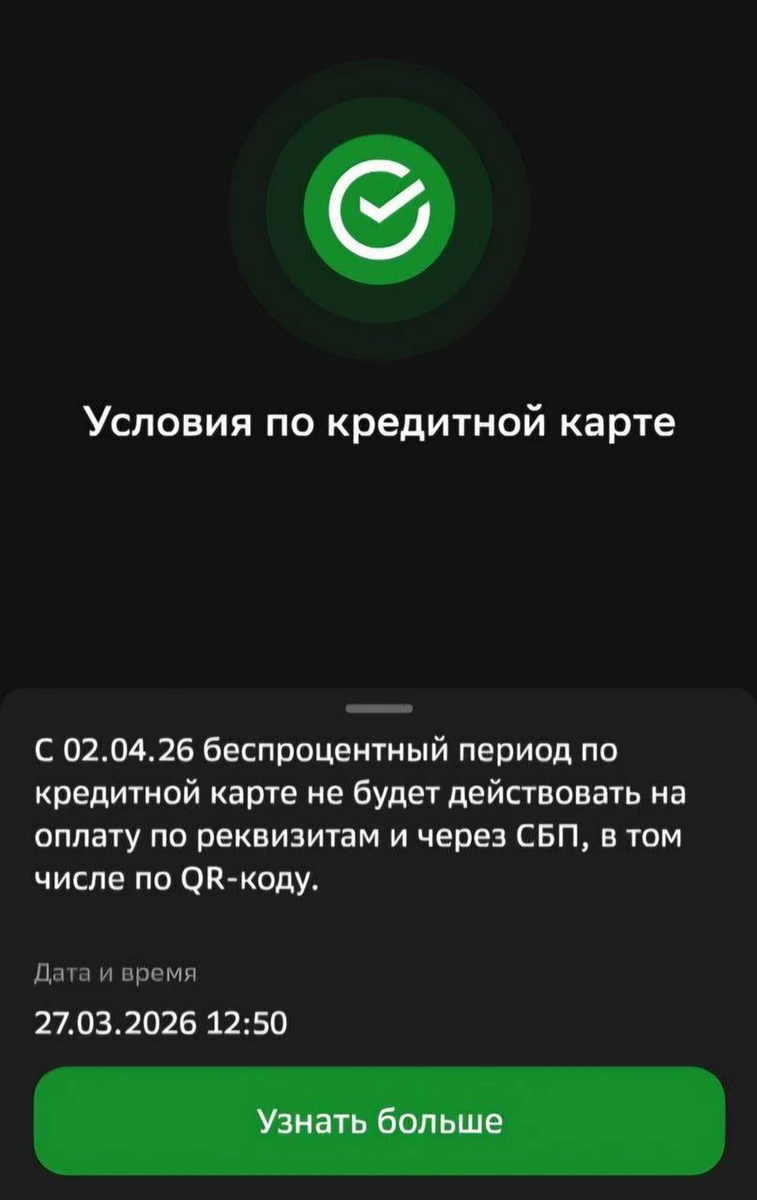 Итак, новости. С 2 апреля 2026 года действие беспроцентного периода перестанет распространяться на суммы операций оплаты с использованием QR-кода СБП / переводов в рамках сервисов Банка через СБП с использованием «Сбербанк Онлайн» и на суммы переводов по свободным реквизитам: реквизиты, которые заполняются путем внесения информации о получателе платежа в мобильном приложении СберБанк Онлайн в поле «Оплата по реквизитам», путем сканирования QR‑кода, содержащего реквизиты, а также путем заполнения реквизитов на экране банкоматов или при составлении платежного поручения о переводе по реквизитам в отделении банка. Ссылка на новость Что это означает для простых пользователей: Платить кредитной картой только через прикладывание к терминалу! Но на самом деле сильнее всего это ударяет по тем, кто крутит кредитную карусель, раньше можно было выводить деньги на НСЖ через пополнение по реквизитам. Что делать? Про карту Фикс писала подробнее тут: