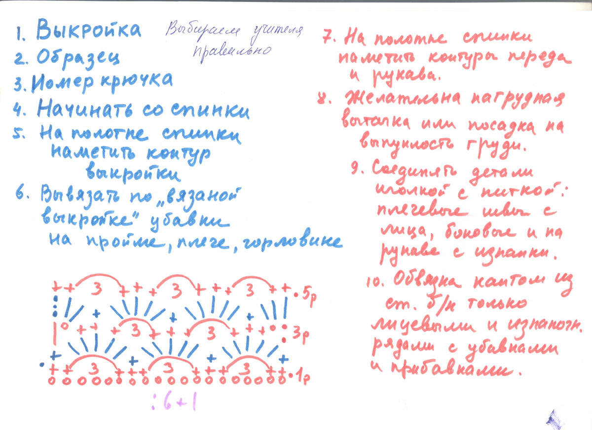 В Интернете можно встретить много авторов - мастеров, которые предлагают свои подходы и рекомендации по вязанию крючком. К сожалению много амбициозных и самонадеянных "мастеров". Чтобы довериться очередному "мастеру", помните о главных критериях, необходимых для получения хорошего результата. Для начала вязания определённой модели у вас должна быть выкройка по снятым меркам. Выкройка для вязания отличается от выкройки для шитья. Свяжите образец основной вязки, подбирая номер крючка. Образец вяжите по схеме, а не на слух. Учитесь читать схемы - это грамота вязания крючком.