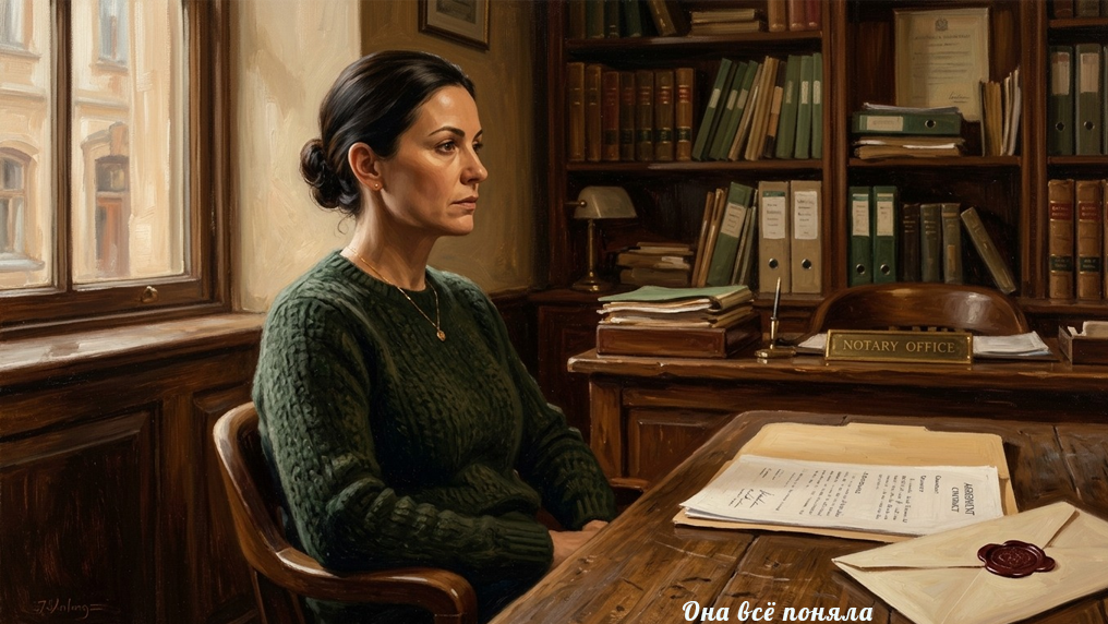 За столом нотариуса Олег что-то говорил — про сроки, про оформление. Нотариус делал пометки. Марина кивала, когда на неё смотрели. Олег наклонился к ней: