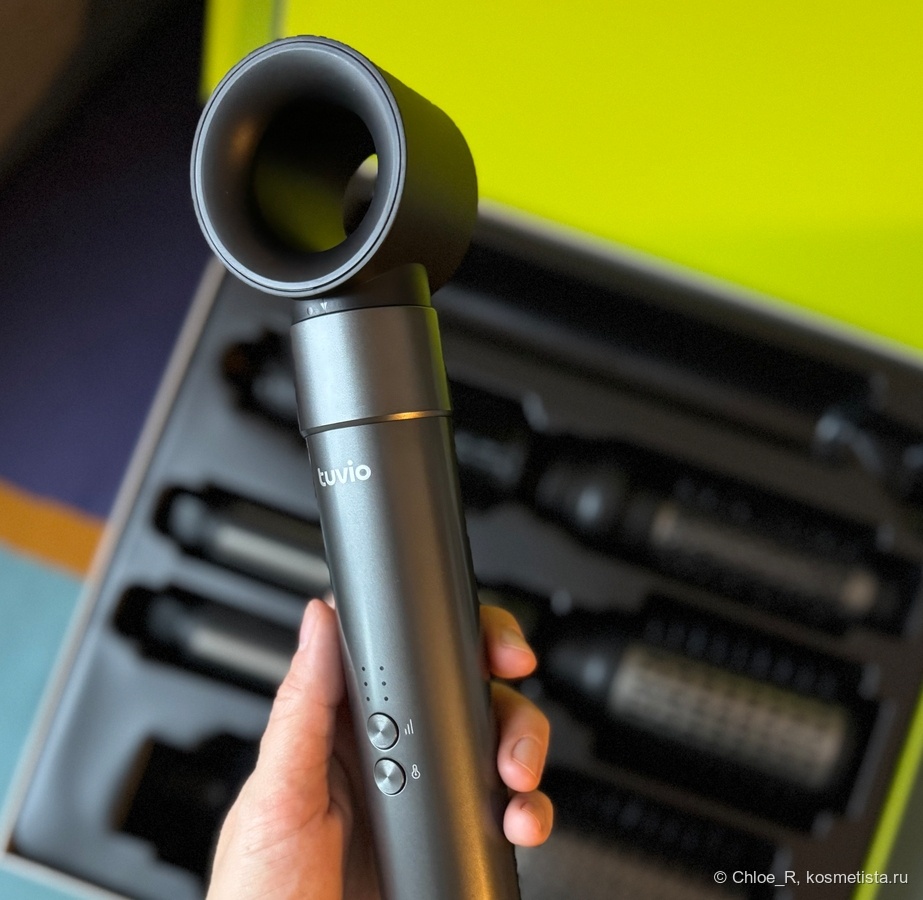 Тувио хоть и не позицирнирует себя аналогом Дайсон, но будто это напрашивается само собой) У него 7 насадок, при этом насадка-фен тоже округлой формы: