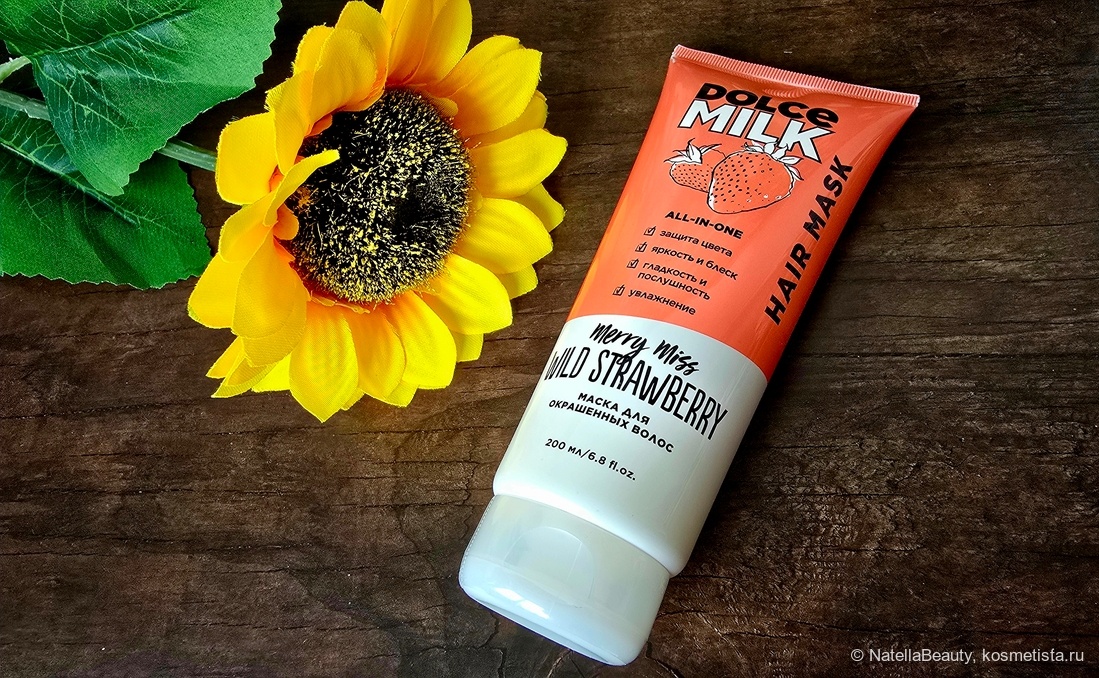Маски для волос — постоянный продукт на моей полочке в ванной. Когда ты всю жизнь красишь волосы в блонд без постоянного ухода никак не обойтись… Маски меняются, любимые часто повторяются, но я всегда готова к новым открытиям и поиску жемчужин в огромном ассортименте полочек в магазинах. Бренд Dolce Milk привлек мое внимание своими ароматами. У меня уже были гели для душа бренда и захотелось продолжить своё знакомство и попробовать что-то для волос. Упаковка/Оформление. Маска находится в пластиковой тубе и закрывается крышкой флип-топ белого цвета. Дизайн яркий, летний, озорной. На упаковке есть вся необходимая информация о продукте. Изначально крышечка флакончика закрыта защитной слюдой. Объём: 200 мл. Производство: Россия. Срок годности после вскрытия: 6 месяцев Аромат потрясающий, немного химозненький, клубничный. Очень приятный, ощущается во время смывки и держится на волосах лёгким облачком. Текстура обволакивающая, не жидкая, именно как маска для волос. Маска прекрасно распределя