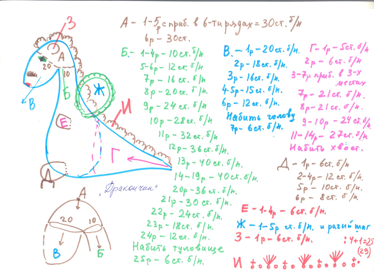 Начните вязать с макушки столбиками без накида с прибавками в шести местах. В пятом ряду будет тридцать столбиков без накида. В шестом ряду без прибавок получится тоже тридцать столбиков без накида. Разделите окружность на две части: двадцать петель на мордочку и десять петель на шею. Вяжите по кругу туловище, считая от начала туловища с первого по четвёртый ряд по десять столбиков без накида. На листочке указаны прибавки под буквой "Б". Набейте туловище синтепоном и сделайте двадцать пятый ряд. Хвостиком нити стяните полотно. Довяжите голову с убавками, указанными под буквой "В". Свяжите отдельно хвост с прибавками, указанными под буквой "Г". Под буквой "Д" и "Е" показаны прибавки на задних и передних лапках. Под буквой "Ж" обозначены крылышки, а под буквой "З" - ушки. Под буквой "И" дана схема гребешка, который надо пришить к голове и до